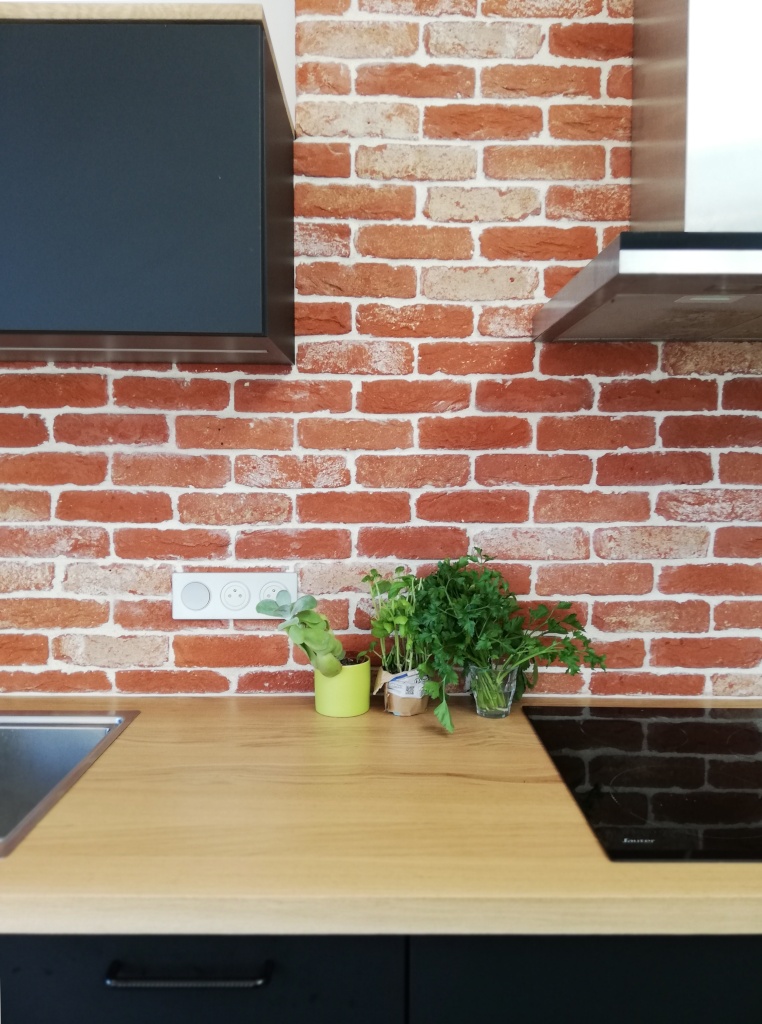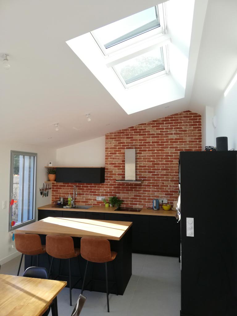 Côté intérieur, le déplacement de la cuisine et la réorganisation des chambres permet de créer un bureau fermé par un verrière existante réutilisée. Le parquet bois est rénové, un placard d'entrée et un meuble bibliothèque sont dessinés pour s'accorder au projet initial. La nouvelle cuisine arbore un mur de brique de parement façonnées à la main qui donne un véritable cachet à la pièce.