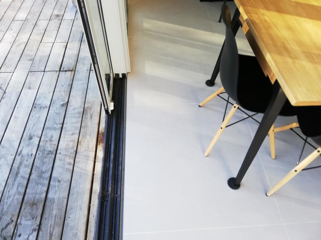 plancher chauffant, isolant Biofib Trio et pare pluie laine de bois, terrasse en châtaignier local