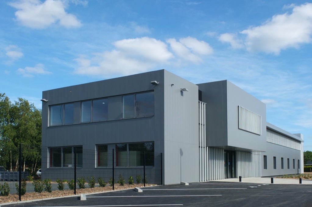 Une peau métallique unifie la partie ancienne et l’extension, une boite en métal ajourée portant l’enseigne est placée à la proue du bâtiment.
