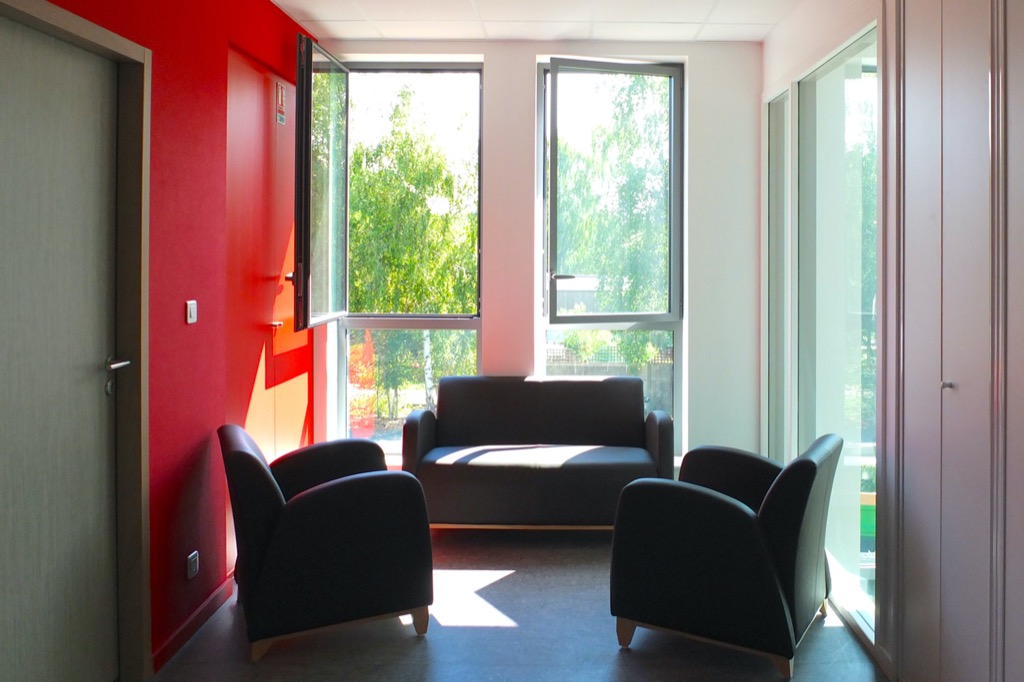 Des brises-soleils en métal ajourés et une isolation par l’extérieur participent au confort de travail. Les espaces d’accueil et le mobilier sont étudiés pour privilégier la lumière et la vue sur les espaces verts créés à cette occasion.