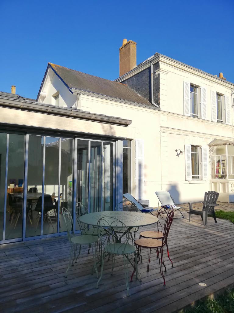 L'extension est traitée à la manière d'un jardin d'hiver, avec de grandes baies ouvrant sur la terrasse en châtaignier, la façade est en briques de parement crème. Toutes les menuiseries sont changées pour des lignes plus contemporaines.