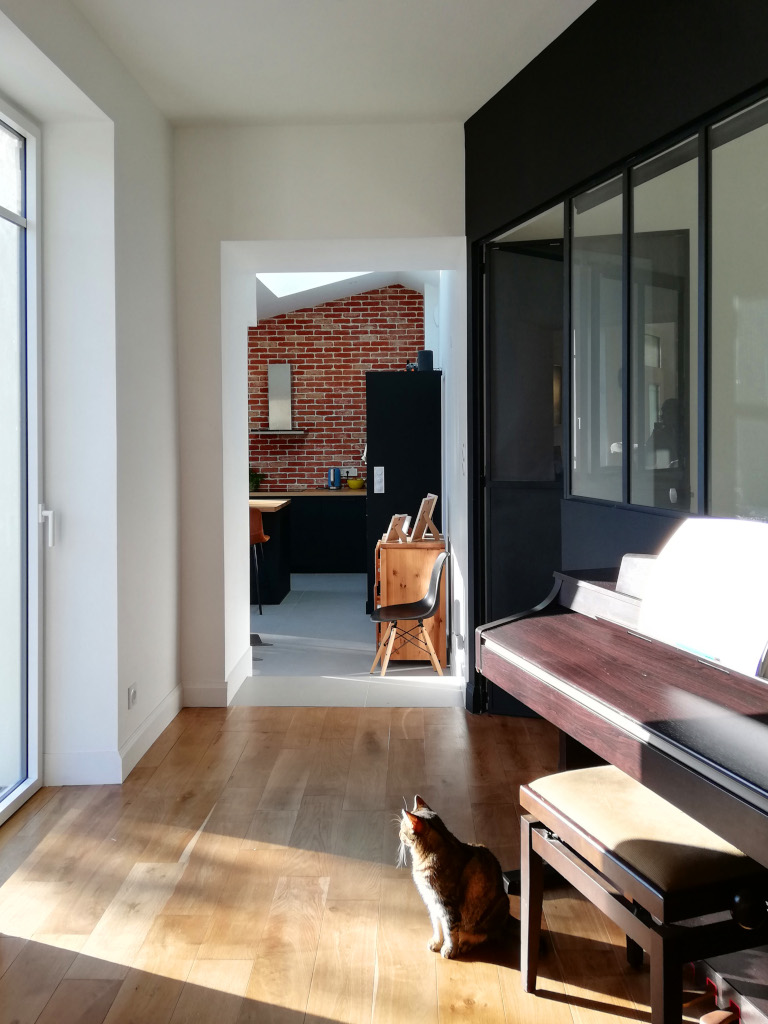 Côté intérieur, le déplacement de la cuisine et la réorganisation des chambres permet de créer un bureau fermé par un verrière existante réutilisée. Le parquet bois est rénové, un placard d'entrée et un meuble bibliothèque sont dessinés pour s'accorder au projet initial. La nouvelle cuisine arbore un mur de brique de parement façonnées à la main qui donne un véritable cachet à la pièce.
