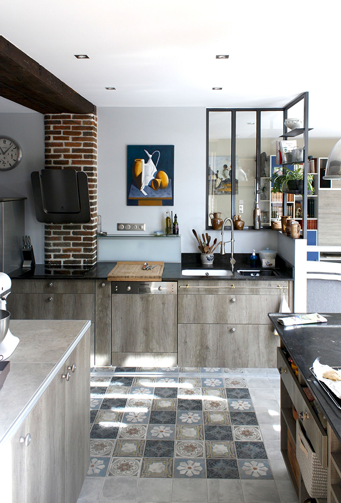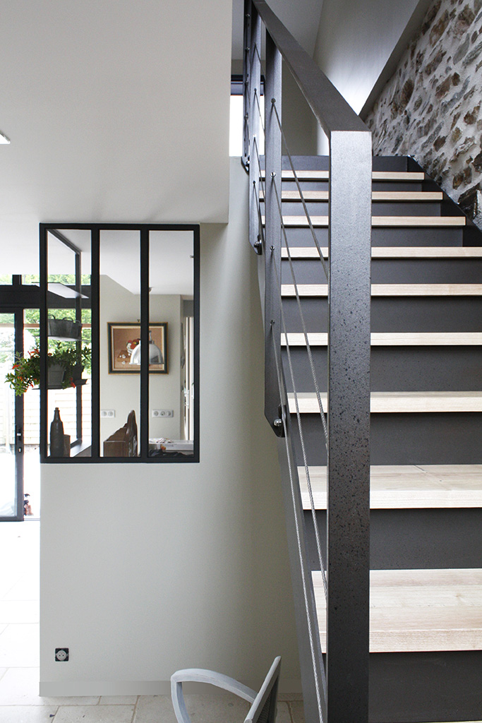 Un travail est réalisé sur la mise en valeur des matériaux intérieurs: un escalier mixte bois/métal dessiné sur mesure longe le mur pierre rénové, l'ancienne ouverture du garage briques/bois s'insèrent dans la cuisine. Le sol en pierre de bourgogne parachève l'ensemble en amenant un cachet plus ancien.