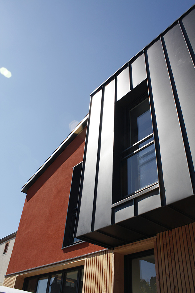 Le volume fermé façade Nord en zinc anthracite est comme un objet en lévitation. Le bardage bois en pin Douglas ajouré apporte de la chaleur et habille les façades du RDC tandis que l'enduit orangé en partie haute rappelle l'architecture brique typique du centre bourg.