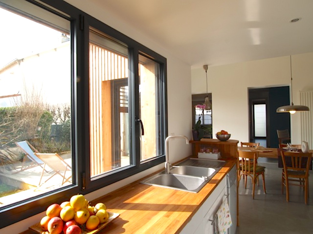 L'intérieur est également travaillé: le dessin des plans de travail en chêne abouté, les zones colorées et coffrages placo, le mur en bardage bois, la position de la table du salon qui peut se rapprocher de la baie en hiver...